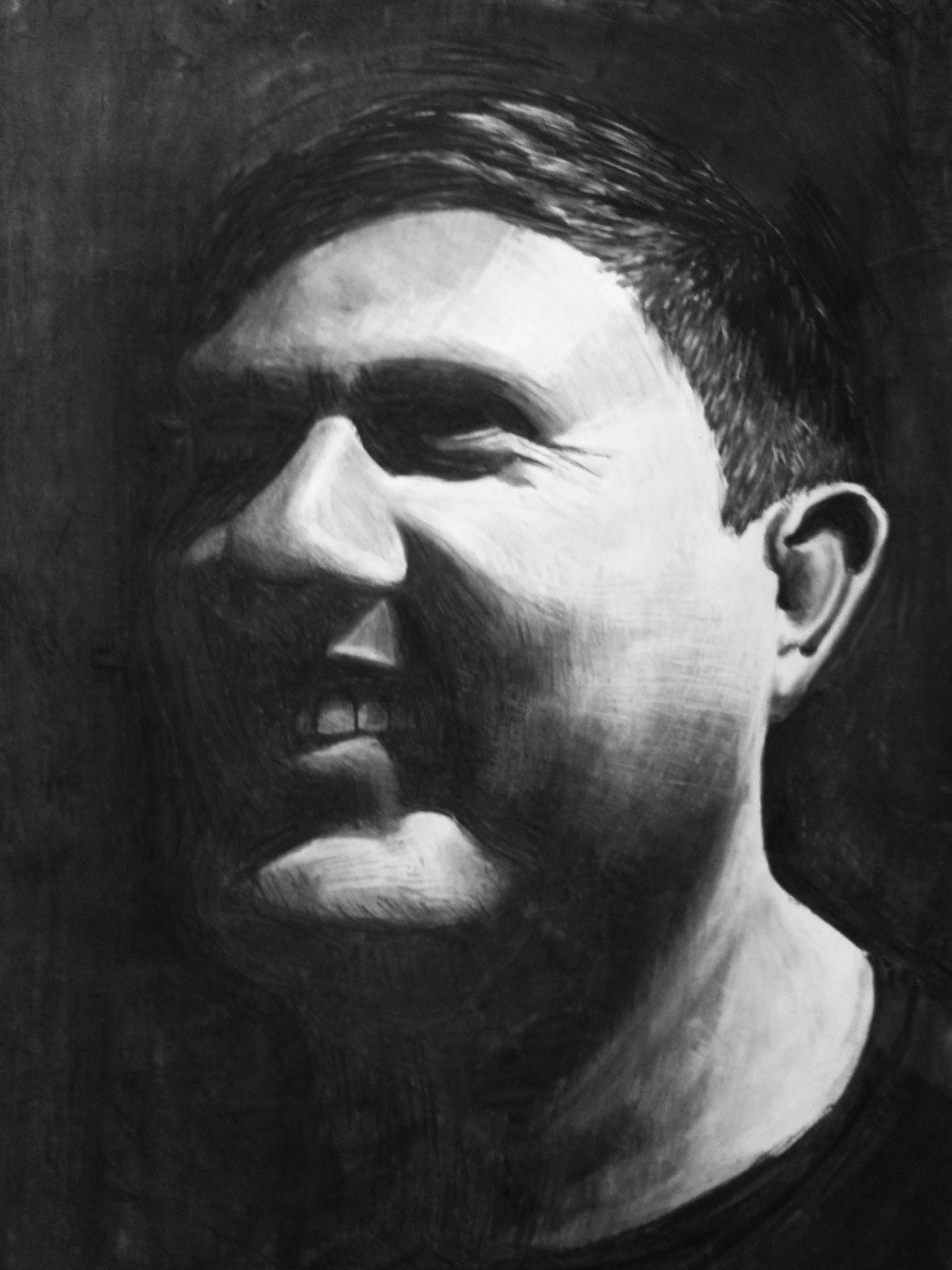 Paul intends to use technology as a starting point and take it back to a traditional medium. This process is resonant in all of his work and is evident in his painting, print and drawings. The selection of portraits originated from photographs taken using a mobile phone, capturing the moment of sincerity and candidness of his subjects. He re-interpreted them using just only charcoal on paper. It is perhaps the oldest artistic medium dating from the time of the cavemen. Also in the renaissance, it was extensively used for preparatory sketches for paintings, but for Paul, this is a finishing point as it still maintains a raw and fresh simplicity. In these portraits, you will see mostly his friends and acquaintances, including some never to be seen strangers too. He has identified the character of his subjects not only through photography but also by the mark-making process itself. There's an intention to reveal the inner quality of the person, by using the versatility of the medium.