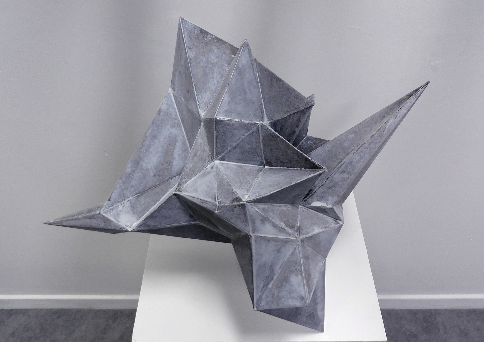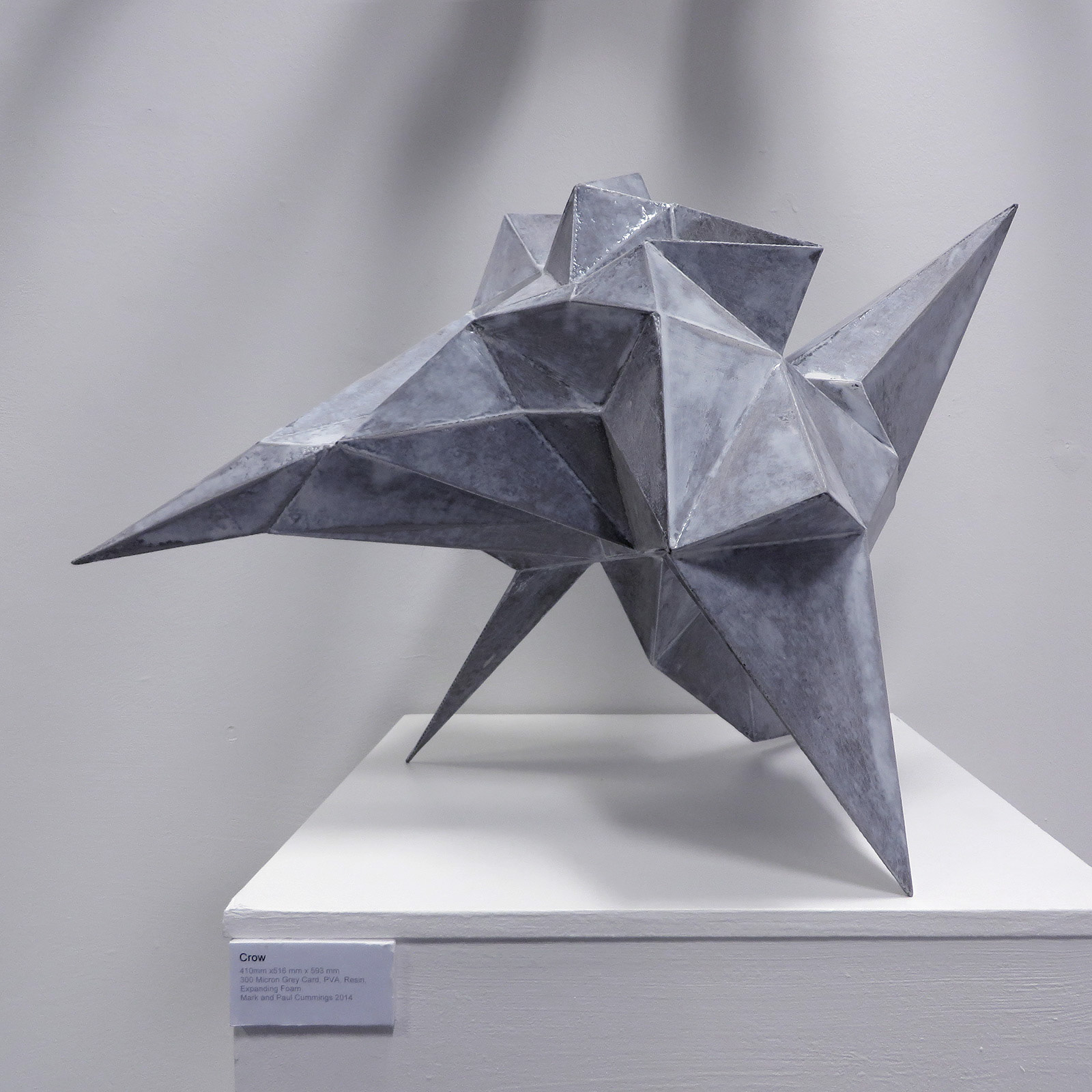 Apollo sometimes took on the form of the crow. In Greek myths, he is the sister of Artemis. The crow in this artwork is abstract, but forms of wings and beak feet can still be recognised, though far removed it still has a 'Crowness' about it. The sculpture seems to possess great mass, yet it is delicately poised on points, as if at the moment of takeoff. The original shape starts life as a regular polygon at the beginning of building the form. The computer had its part in contributing to the displacement using an inbuilt random algorithm. Tweaking variables until a suitable shape that satisfied the vision of a crow appeared.