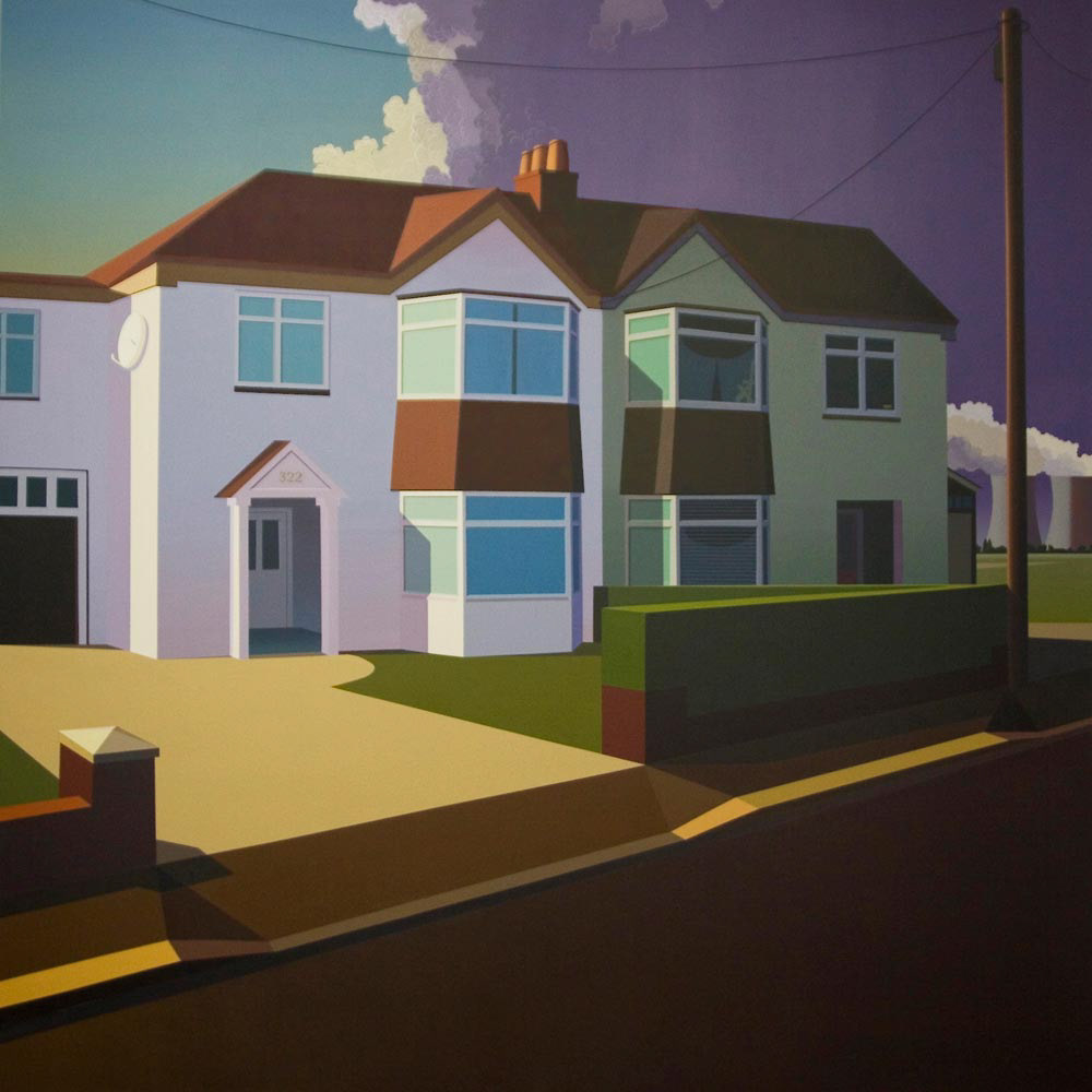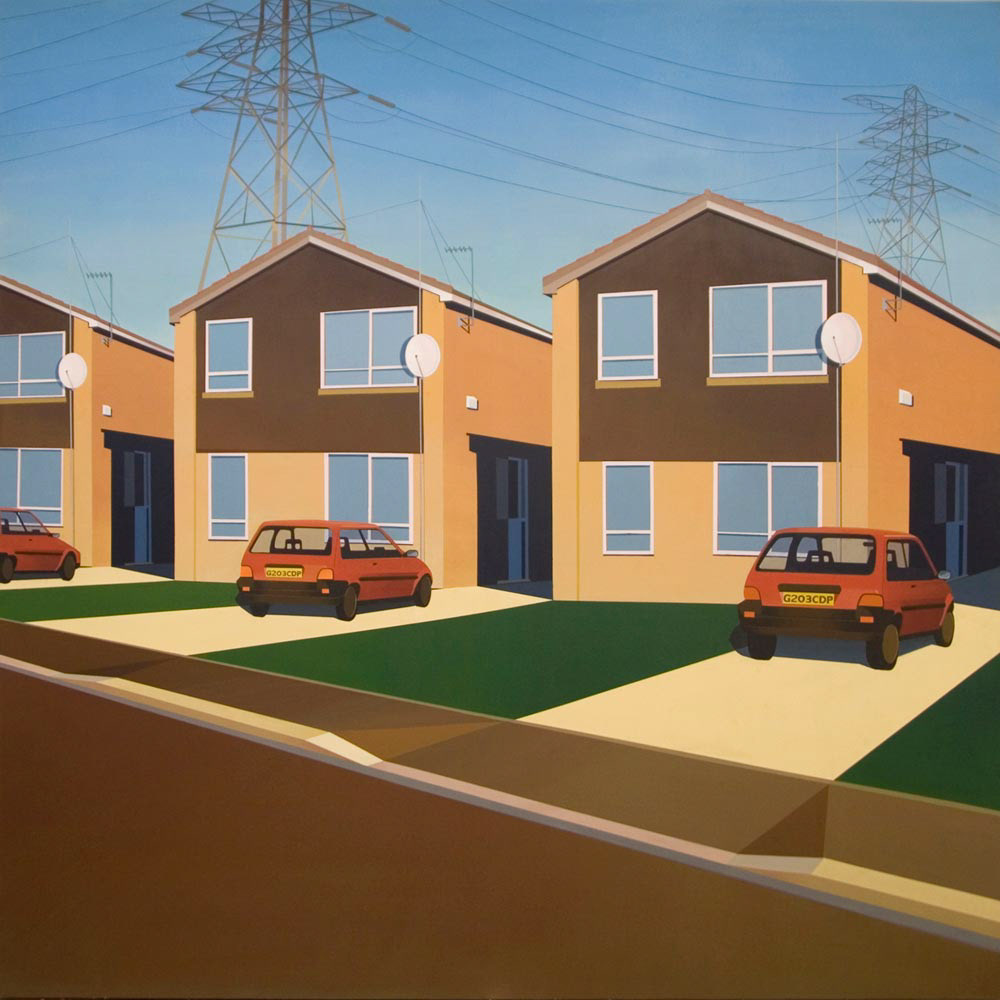 This painting is shortlisted for the prestigious Threadneedle prize 2010. A getaway journey by car offers a fleeting moment of another failed utopia.A cottage conjures itself up as a romantic symbol of a bygone age only to relapse into the modular new build that it is. With a faux Tudor façade, it could be a delight to a Bankers specification. This is a second home purchase that is certainly fallen short of the ideal. Merely it is perhaps a practical decision of commutability and affordability? The topology intends to represent a low-lying agricultural area, possibly an estuary on the fringes of heavy industry, it offers a false rest bite for the commuter. The waterworks suggest a release of invasive odours into the air which already seems contaminated by languid atmospheric dust. The landscape is dissected by the thoroughfare of road, rail and air; nothing in this environment is left to its natural order. Every portion and aspect of the landscape is managed and unitised by man's intervention into a self-interested support system. Rural escapism becomes a paradox and the obstructing road barrier is instrumental for this metaphor by limiting access to the picture plane.