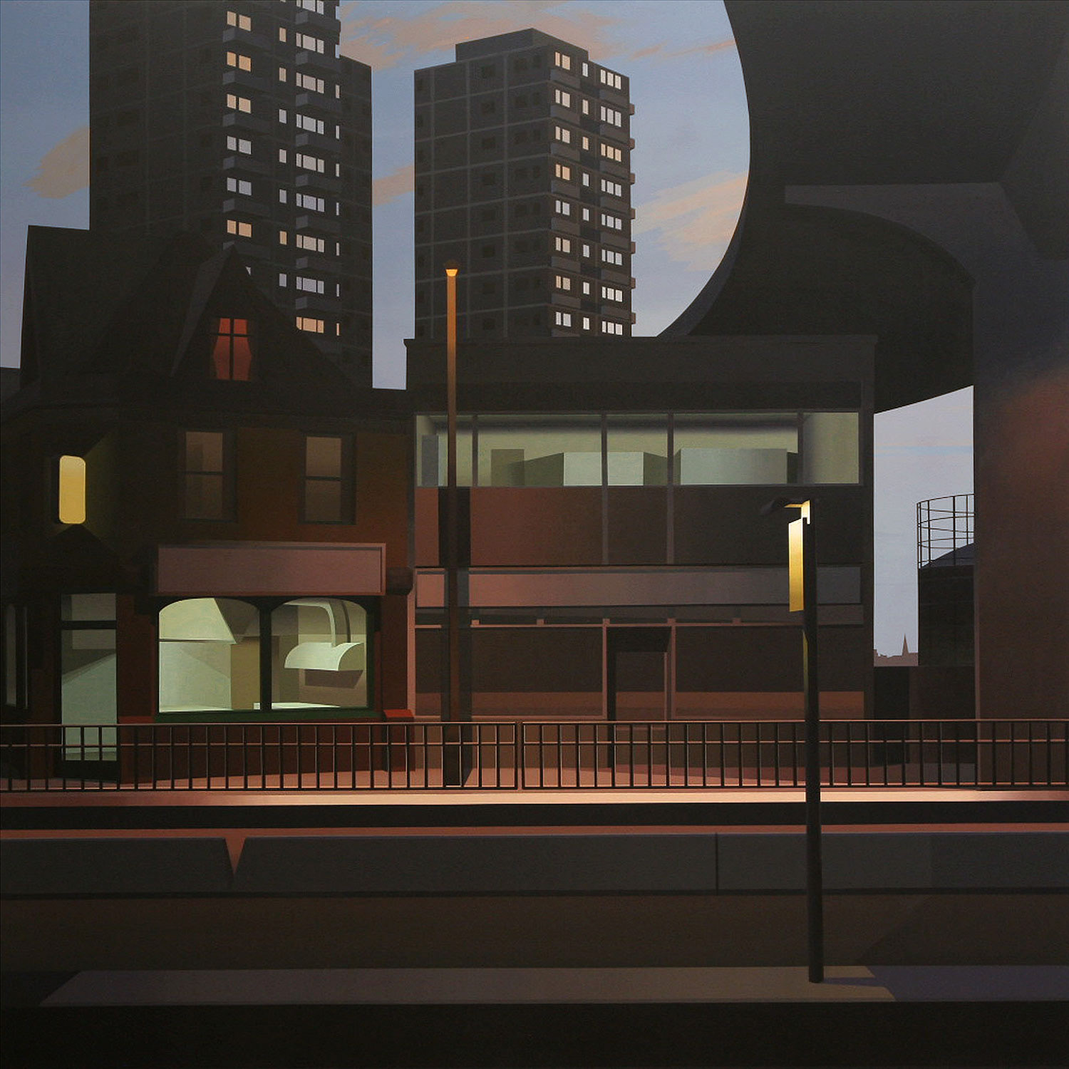 In this continuing series of four paintings, I am working on a documentary and critique of class and social economy. The body of work comments on the irony of the income scale structure that predetermines the habitation of our failed utopias. To compound this further the work demonstrates the pervasive infrastructure that is a persistent reminder of the inescapable dependency from the system we are assimilated into.