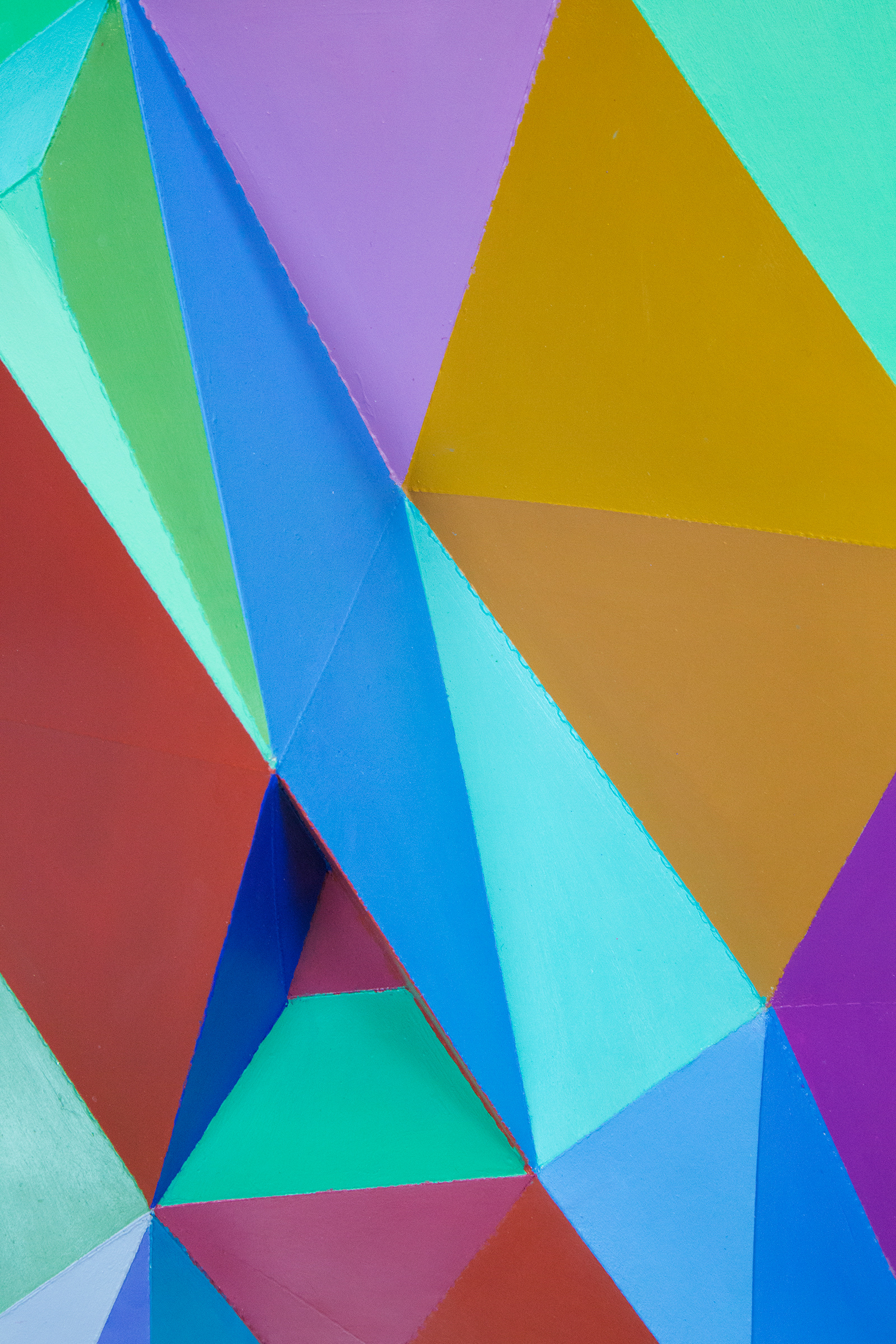 This wall hanging is brightly painted in such a way as to simulate a light surface. It consists of only three colours that are projections on it, but the mix of these lights creates many more hues on the undulating surface. The three primary colours shone on the work are red, green and blue. Yellow cyan and magenta are the secondary mixes of colours. It is interesting to note the multitude of hues that are created by just three initial colours. With all ancient literature, primary energies that come in threes are creative forces, these initial energies then divide further to create reality. The light primaries are explicit in this concept as the entire range of the spectrum can be made from red, green and blue. This artwork is a concept exclusively calculated algorithmically from a computer. It is an attempt to manifest a concept that depicts the real world through simulation. This artwork is perfect for a wall in a brightly lit situation amongst other colours or against a white wall where the colours can jump out.